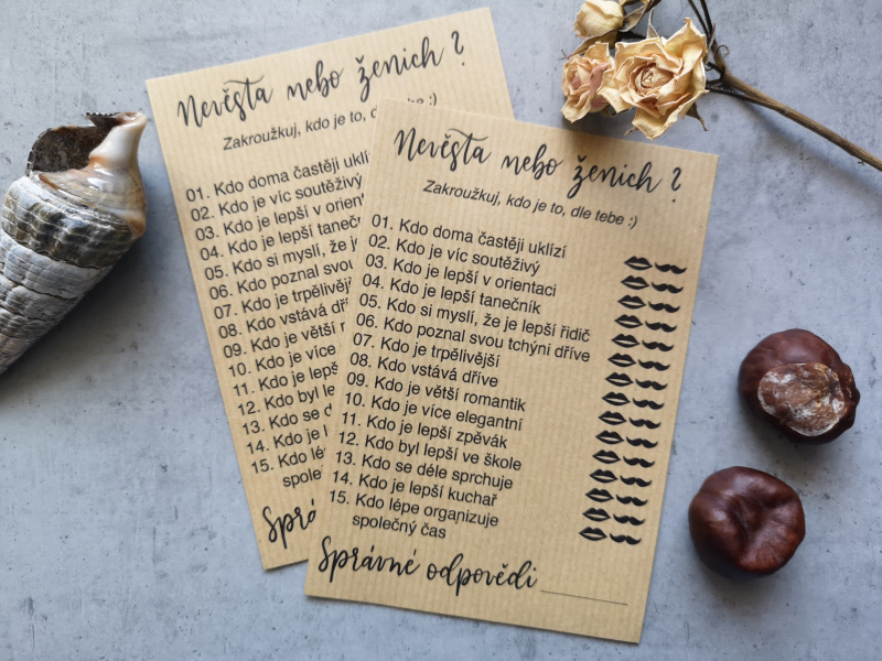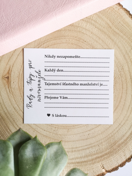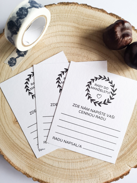 Skladem máme tiskoviny pro hosty, jako jsou rady do manželství, svatební kvíz, vzkazy k prvnímu výročí a další.